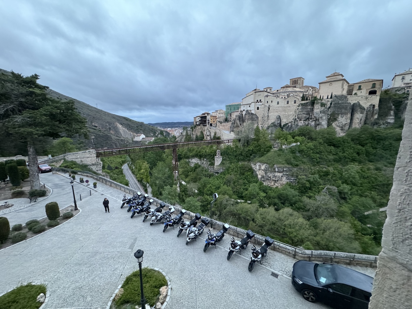 Leaving Consuegra took us on a path through lush fields of olive groves, vineyards and wheatfields. The terrain slowly changed to become hillier as we enjoyed the long sweepers breaking the monotony of the boring highway. We were on a fast run to Cuenca and a return to the lovely mountain roads we crave. Overlooking the Jucar River, the picturesque streets, antique facades and cathedral are all worthy sites, but Cuenca is really known for its hanging houses which seem to defy gravity as they hang out over the abyss below.