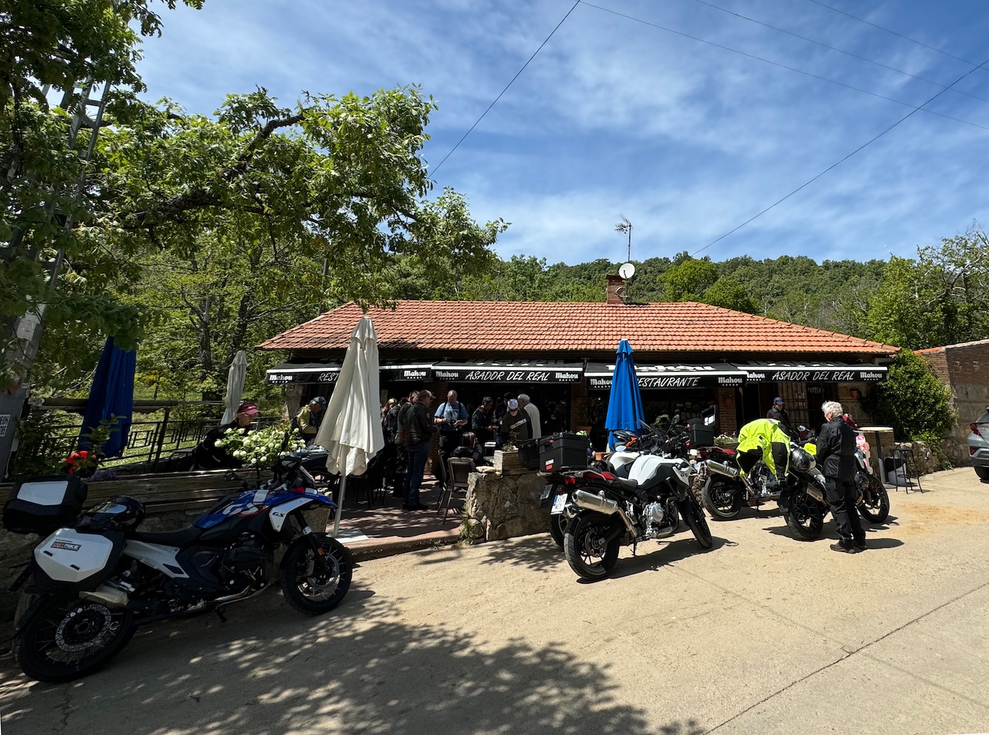 Spring hadn’t yet arrived in the mountains as we approached Jerandilla and, as the temperatures kept our bodies cool, the heated grips blazed on to keep my hands warm. The cool weather brought with it a light rain as we prepared to leave the next morning. Pulling away, the temperature gauge on the TFT display read 7° Celsius, which I quickly calculated to be about 44° Fahrenheit. The beautiful mountain roads we rode reminded me of Colorado as we followed a river meandering through endless stands of tall pines. I thought to myself, this would have been a great ride in clear weather, but as it was the only rain we experienced during our tour, I couldn’t complain. As that thought passed through my brain, the rain picked up and the temperature dropped another degree. Chilled, our morning stop couldn’t come fast enough. Luckily, the coffeeshop we pulled into had a roaring fire to warm up next to–thanks again to Sergi and Chano and their local knowledge!