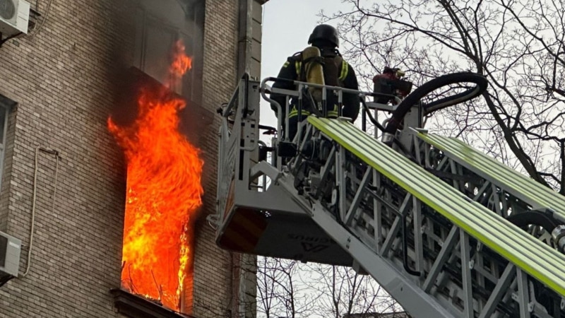 A woman told RFE/RL at the scene that she and her husband ran into a hallway of their third-floor apartment after hearing explosions. She said they taped up a broken window before more explosions and damage occurred.